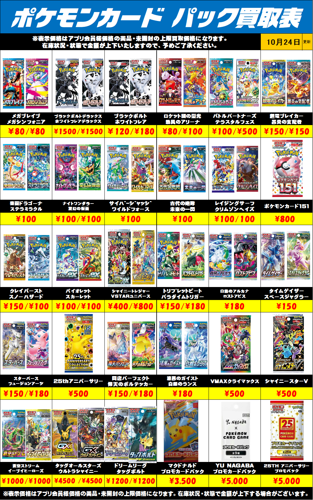 ポケモンカード未開封パック買取リストを更新しました! 10/24~ 当日であっても予告なく在庫により金額が上下する場合がございます。 予めご了承ください