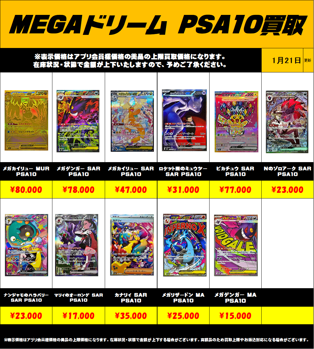 超高額買取!! MEGAドリームPSA10買取リスト更新しました!1/21~