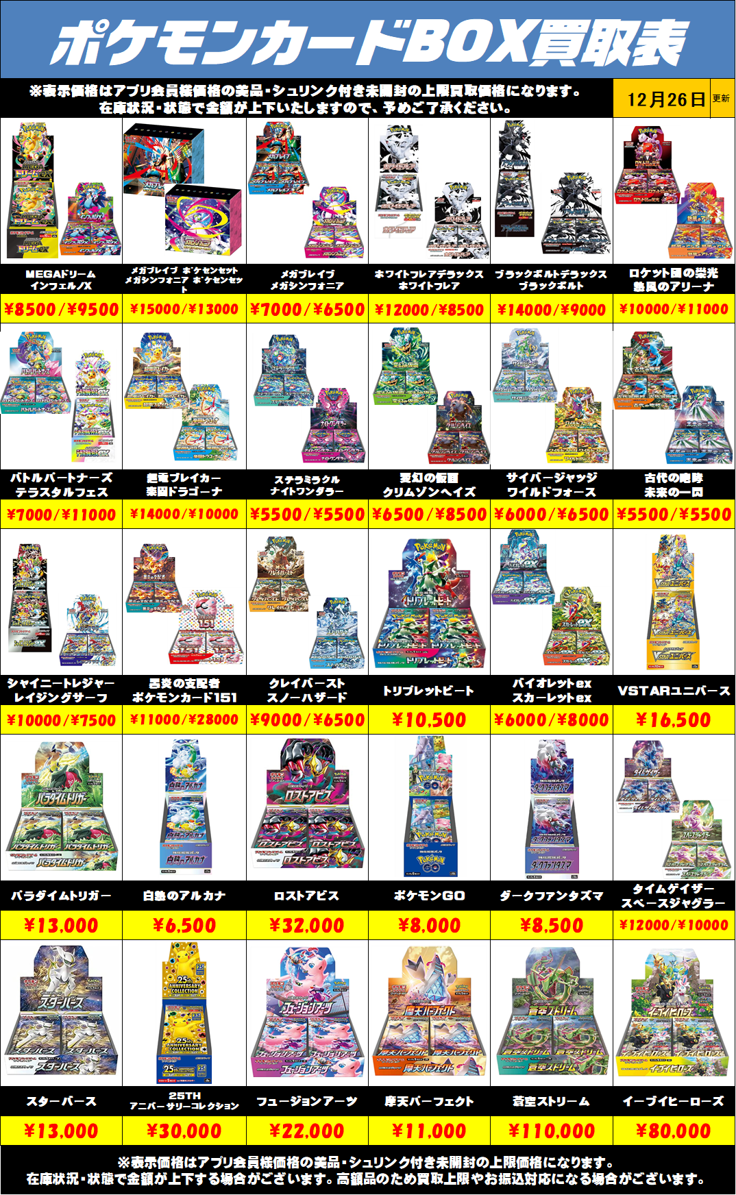 ポケモンカードBOX買取リストを更新しました!12/26~