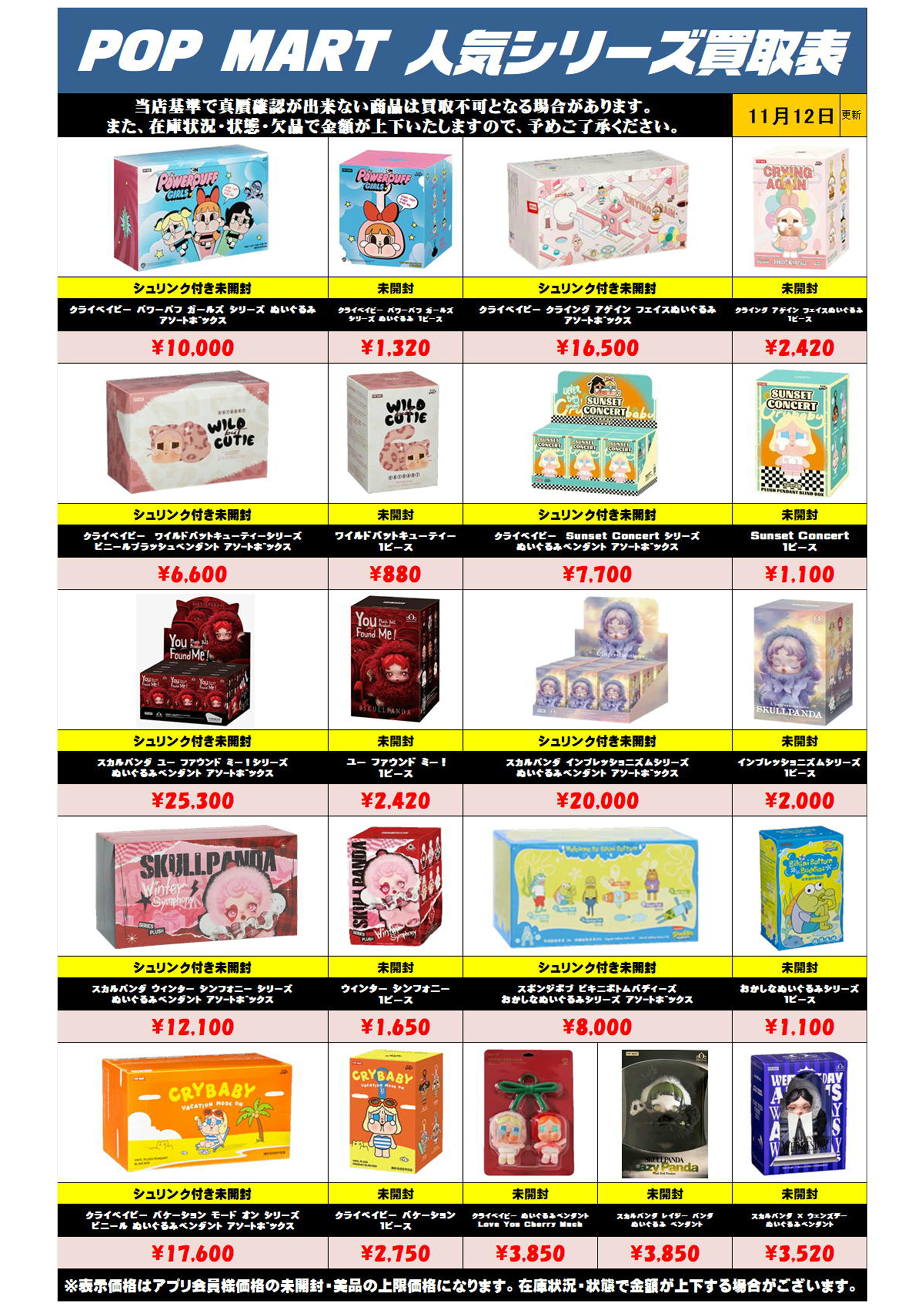 ポップマート クライベイビー・スカルパンダシリーズも高額買取実施中です! 11/12~