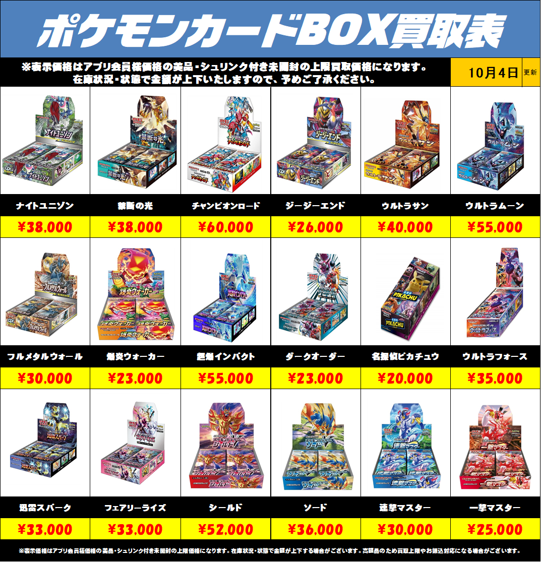 2022/1/3 カードなので在庫次第で変わります!!!! ポケモンカードBOX 買取強化中 更新しました!!!! 在庫で変動いたしますので、参考程度にお考えください 型番 品名 買取 買取金額 SM …