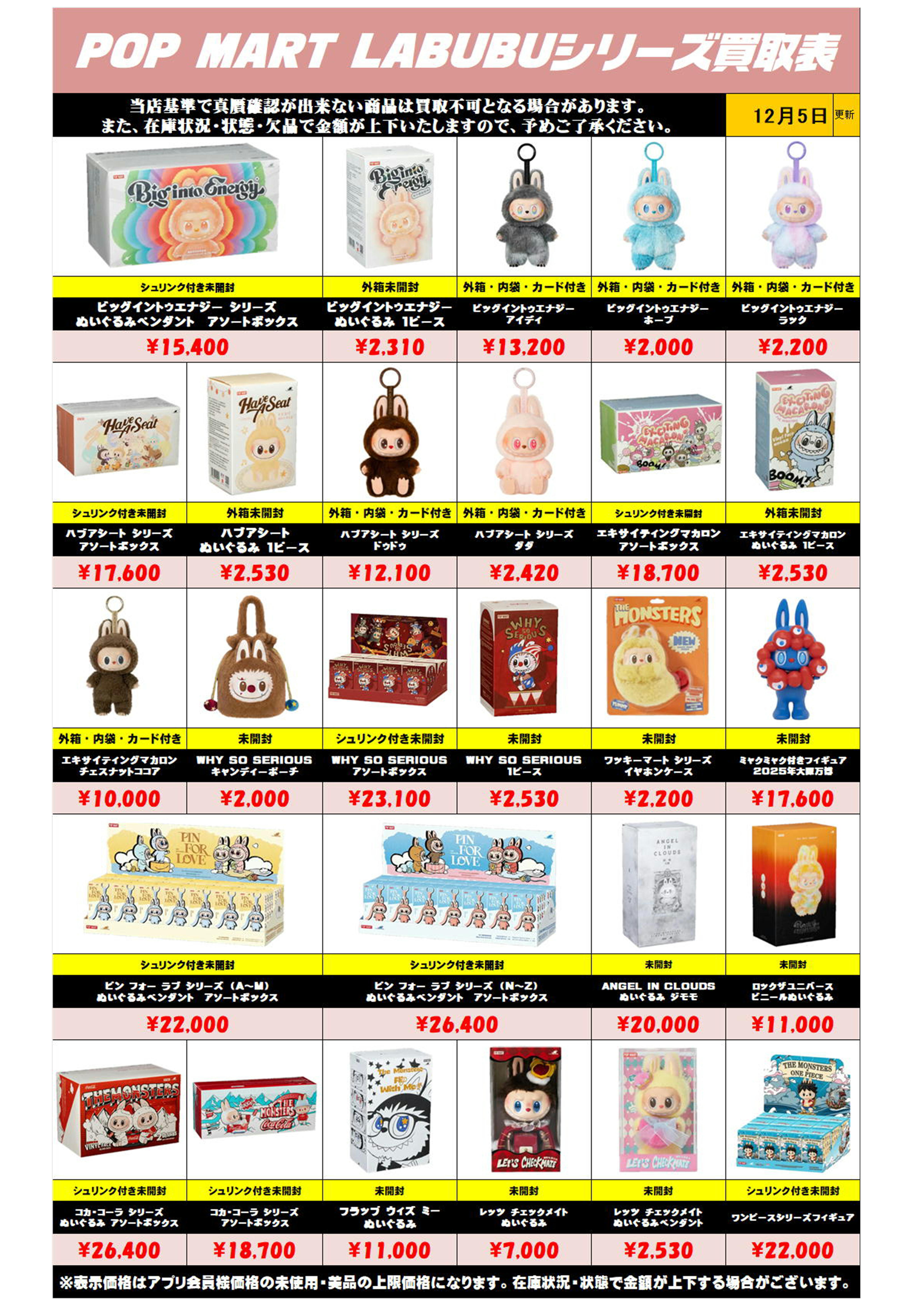 また、在庫状況・状態・欠品などでの金額が変動や、買取上限がございます。予めご了承ください。