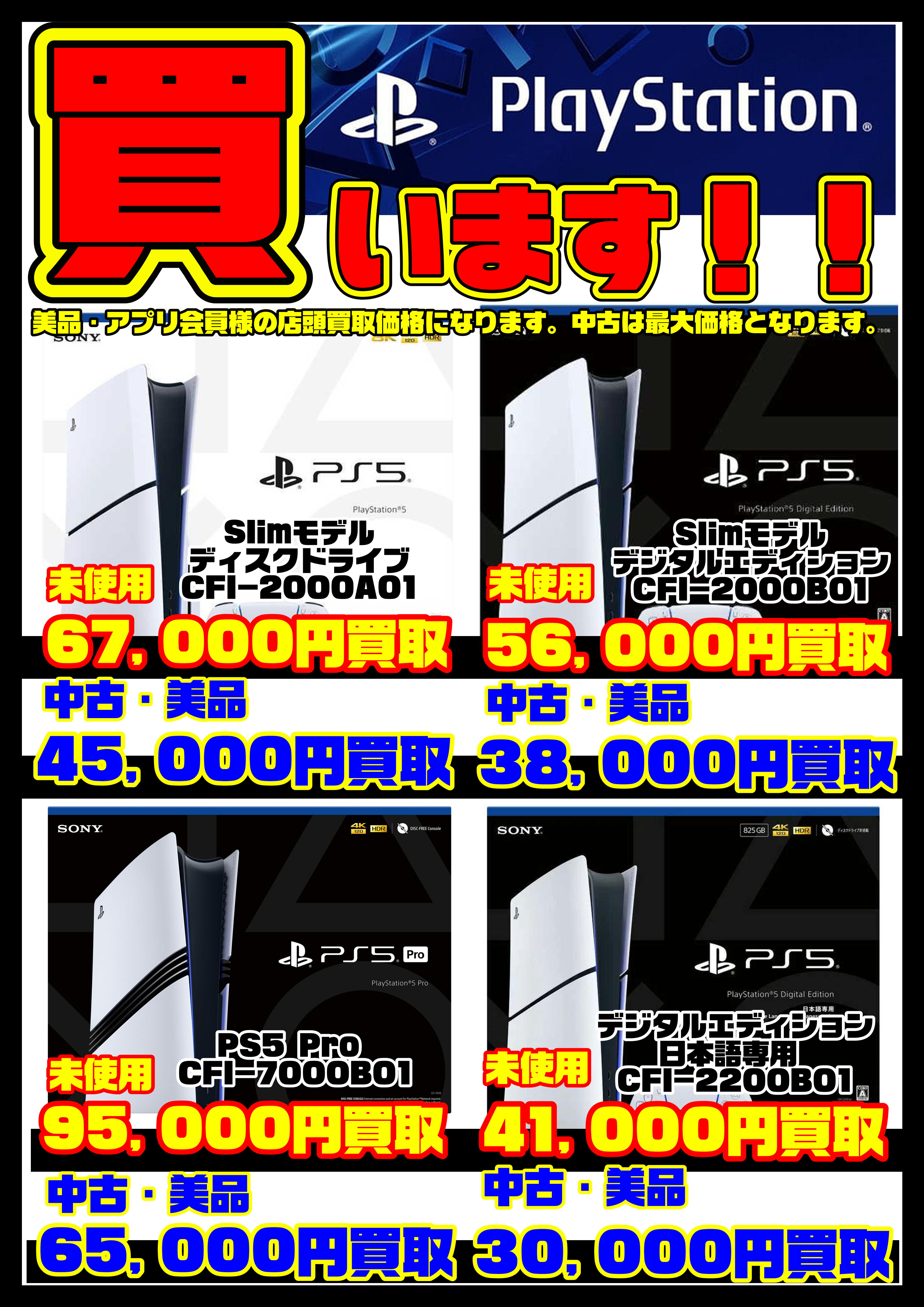 | PS5 | PS5本体 ディスクドライブ版 Slimモデル CFI-2000A01 | 67000 | 45000 |