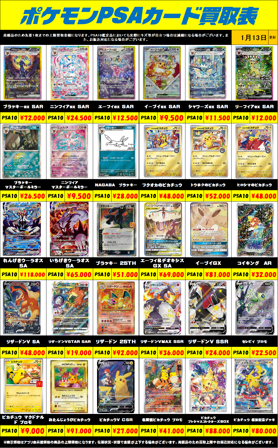 ※表示価格はアプリ会員様・店頭買取の美品の上限価格になります。 相場の変動が激しい為、在庫状況・状態・相場等で金額が予告なく大きく変動する場合がございます。PSAは、おひとり様最大で1日20万円までのお買取りになります。