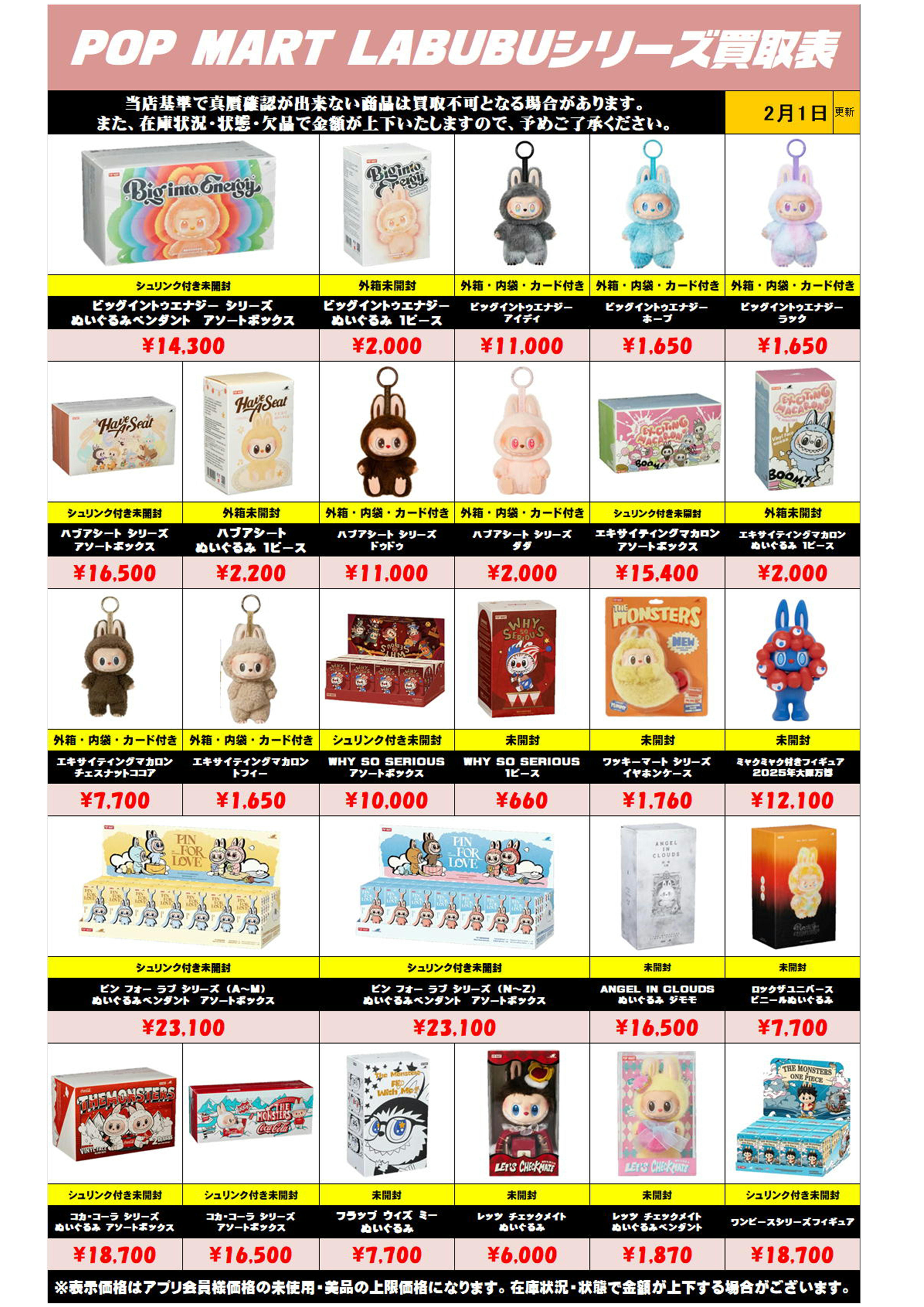 また、在庫状況・状態・欠品などでの金額が変動や、買取上限がございます。予めご了承ください。