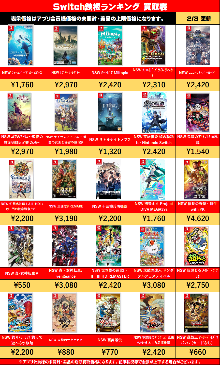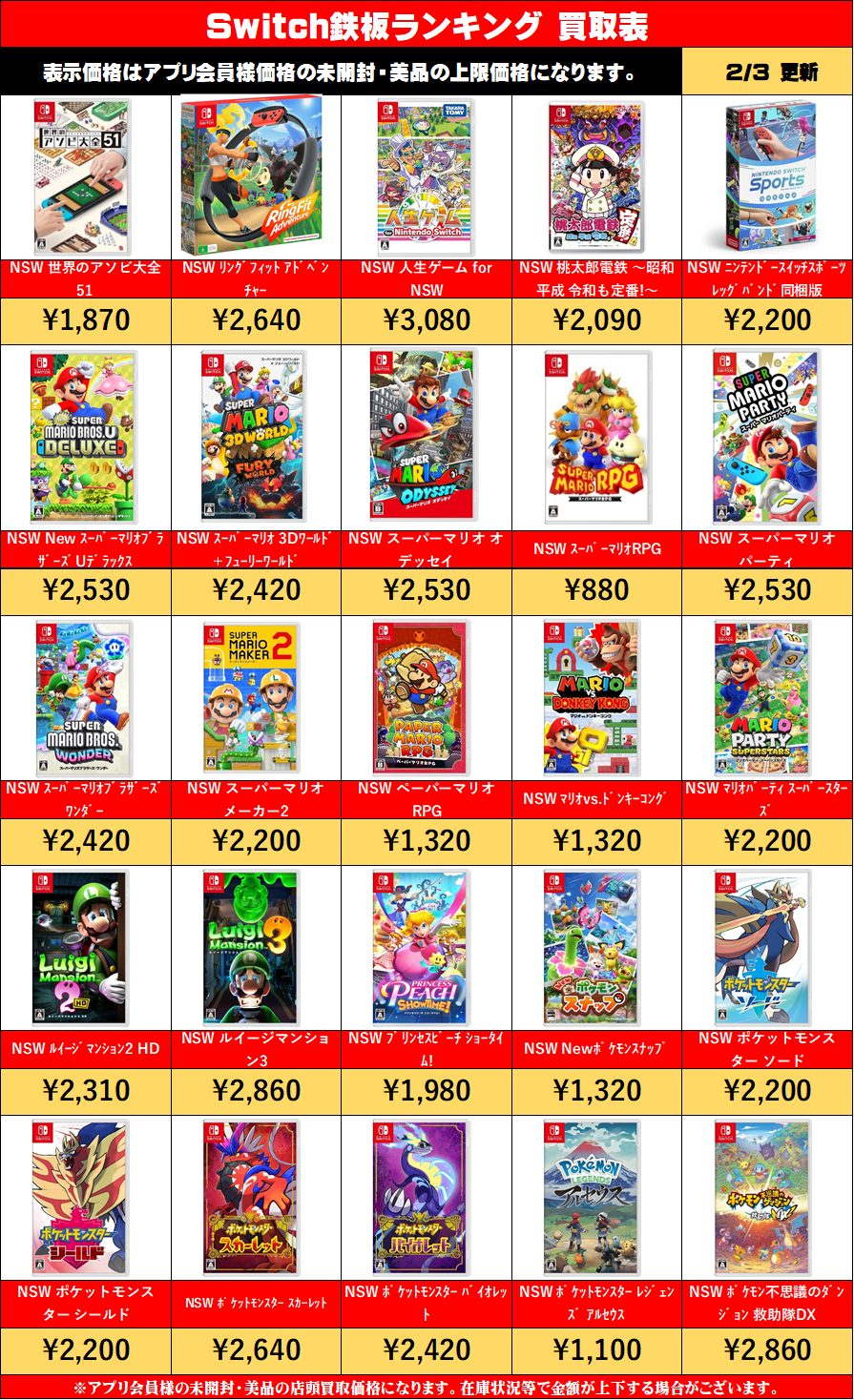 NSW 未使用 中古品 NSW 有機EL版 ネオン 40,000 26,000 NSW 有機EL版 ホワイト 37,000 25,000 NSW 有機EL版 マイニンテンドー 30,000 23,5 …
