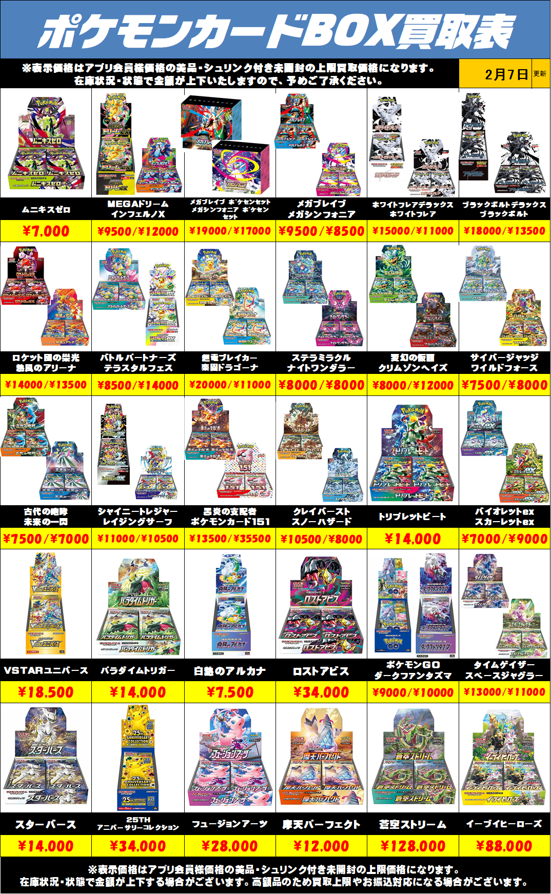 トリプレットビート ¥6500買取 バイオレットEX \14000買取 スカーレットEX ¥6500買取 白熱のアルカナ ¥11000買取 ロストアビス ¥13000買取 スペースジャグラー ¥850 …