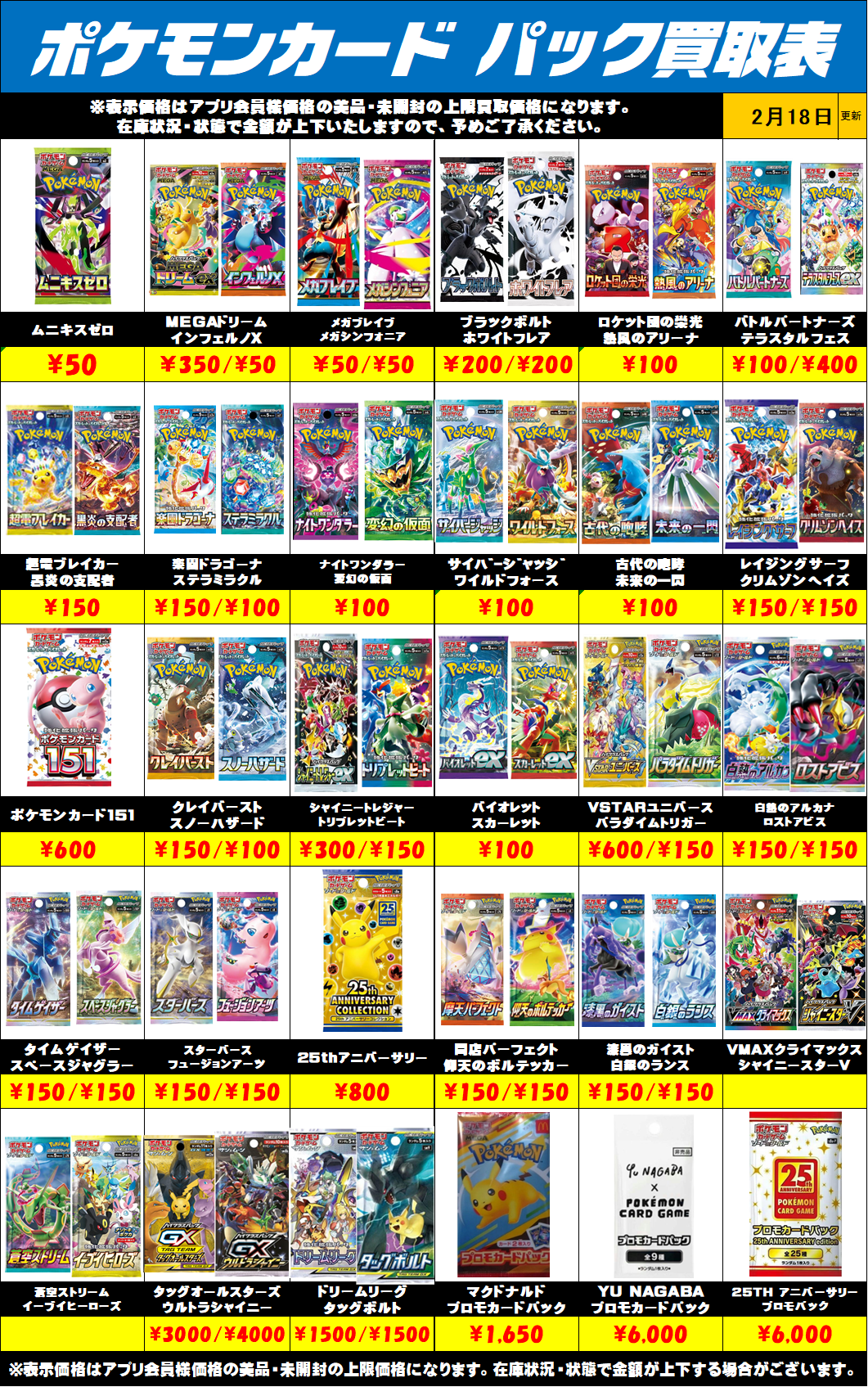 値段表記がないパックに関しましては、現在買取を行っていないものになります。ご了承ください
