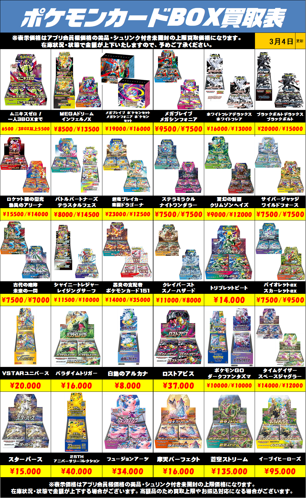 ※表示価格はアプリ会員様・店頭買取の美品の上限価格になります。 相場の変動が激しい為、在庫状況・状態・相場等で金額が予告なく大きく変動する場合がございます。PSAは、おひとり様最大で1日 …
