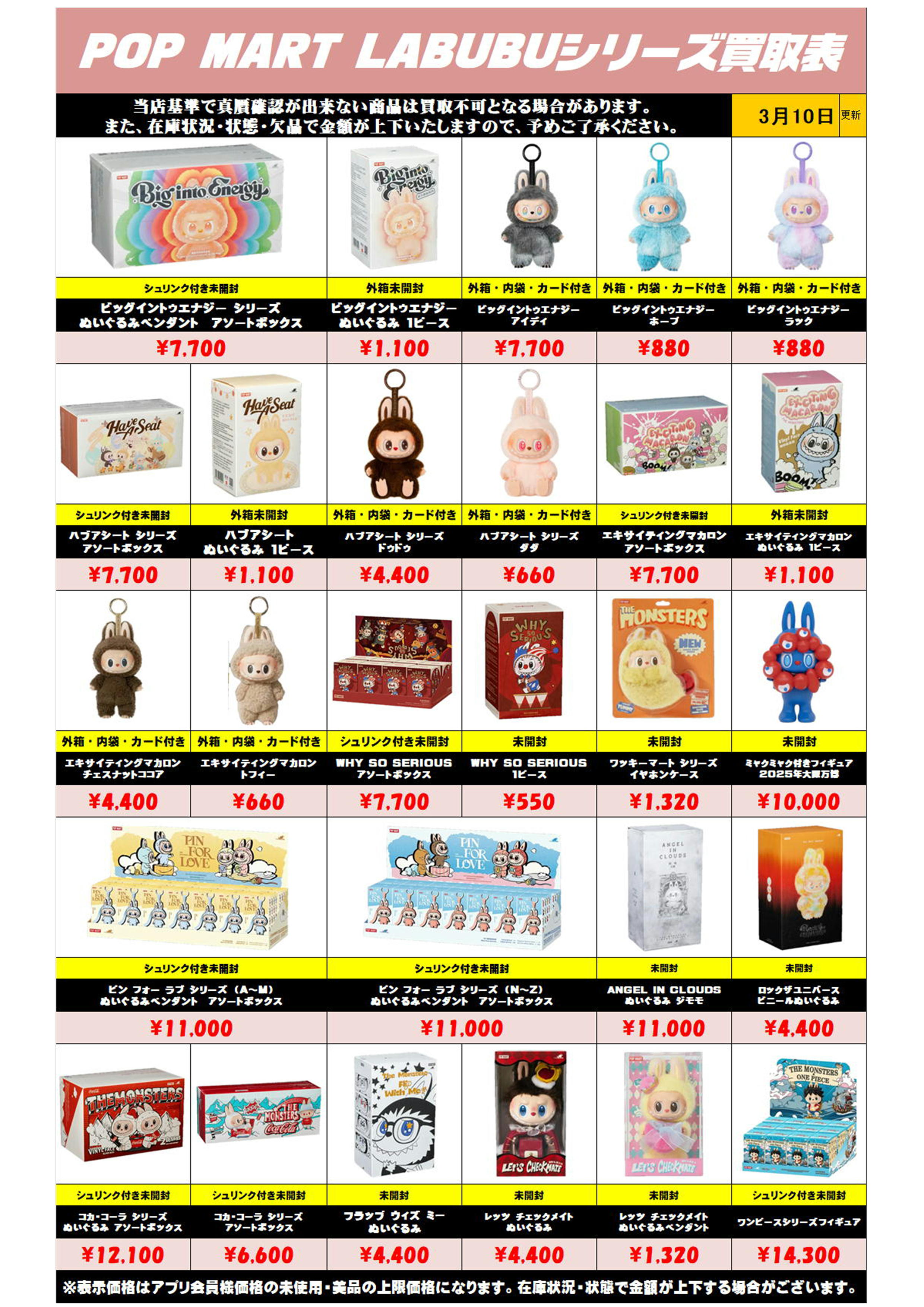 ラブブシリーズも買取リスト更新しました! 3/10~