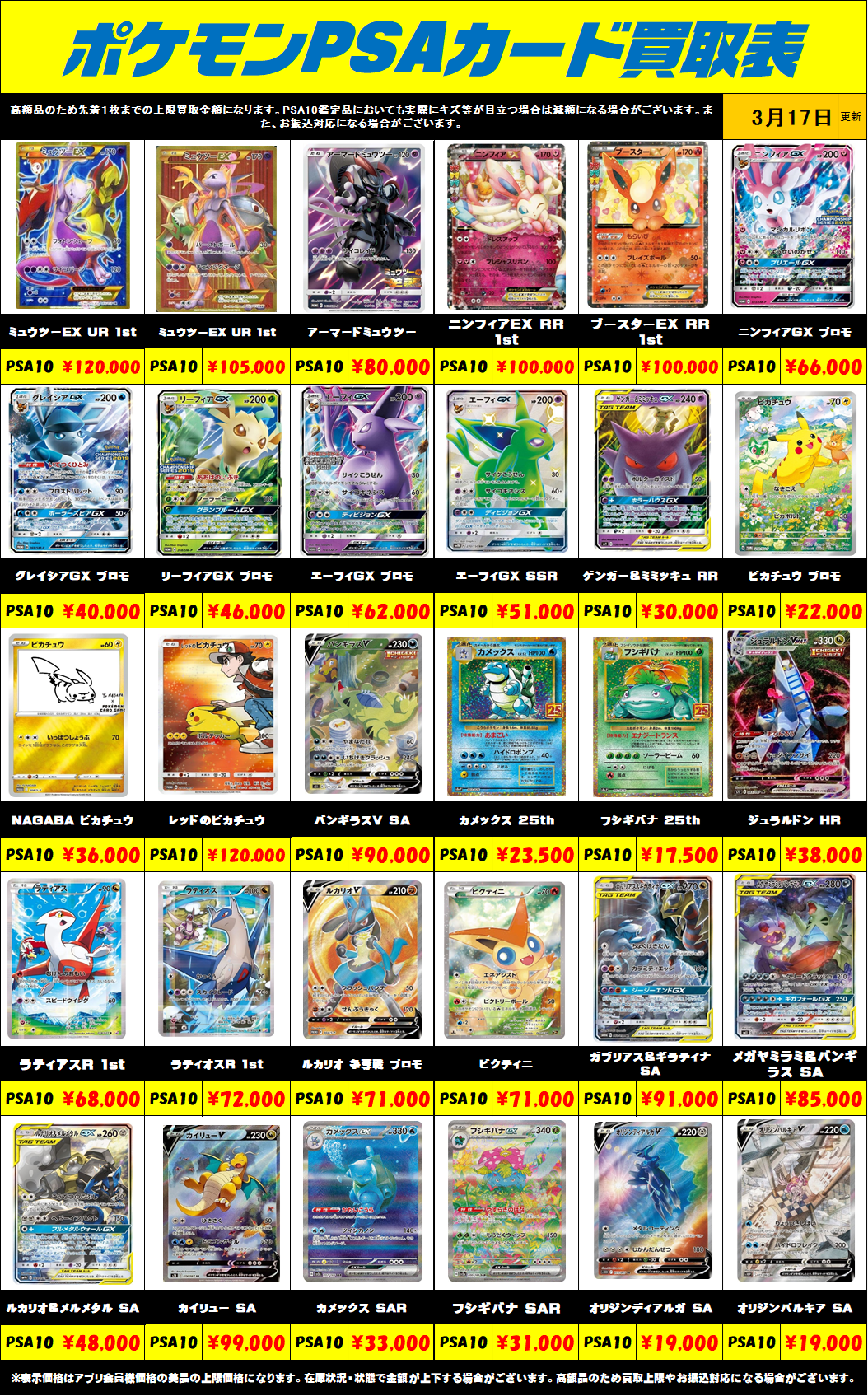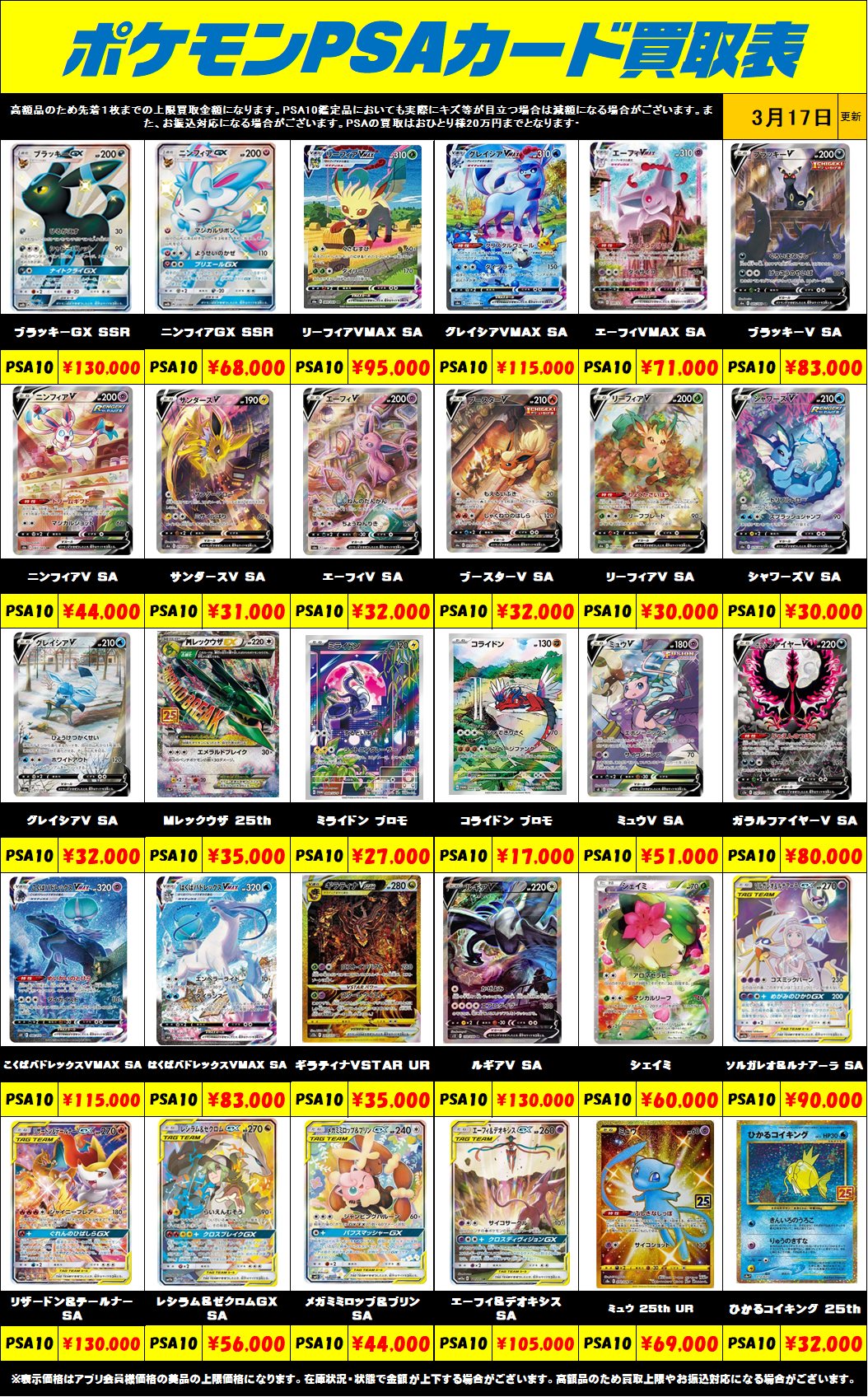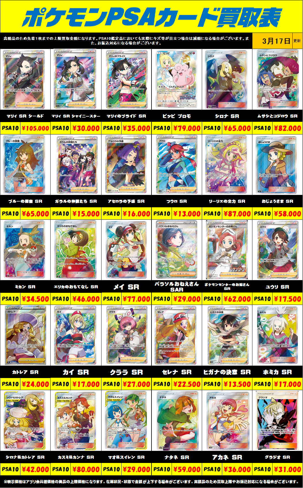 ※表示価格はアプリ会員様・店頭買取の美品の上限価格になります。 相場の変動が激しい為、在庫状況・状態・相場等で金額が予告なく大きく変動する場合がございます。PSAは、おひとり様最大で1日20万円までのお買取りになります。