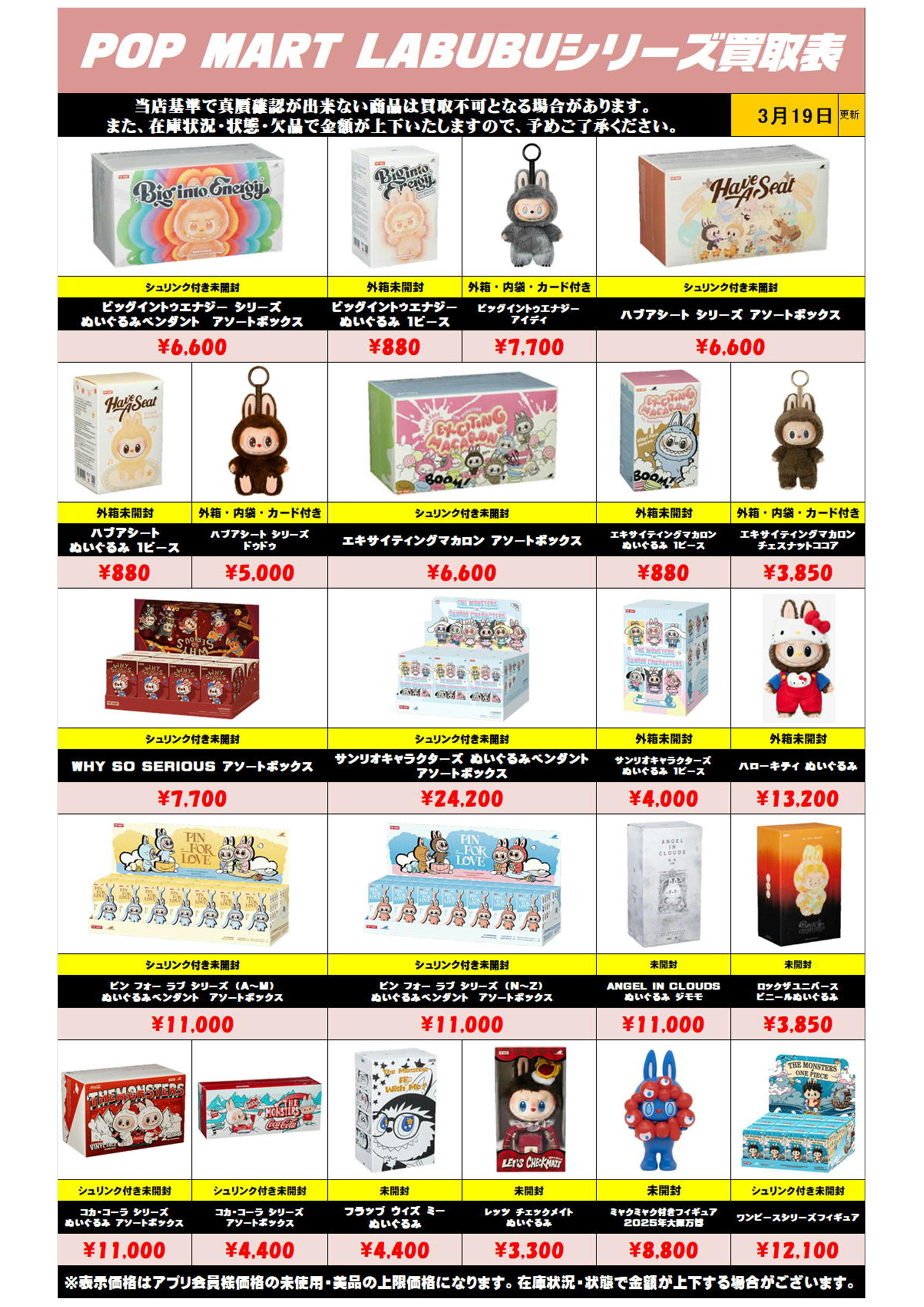 また、在庫状況・状態・欠品などでの金額が変動や、買取上限がございます。予めご了承ください。