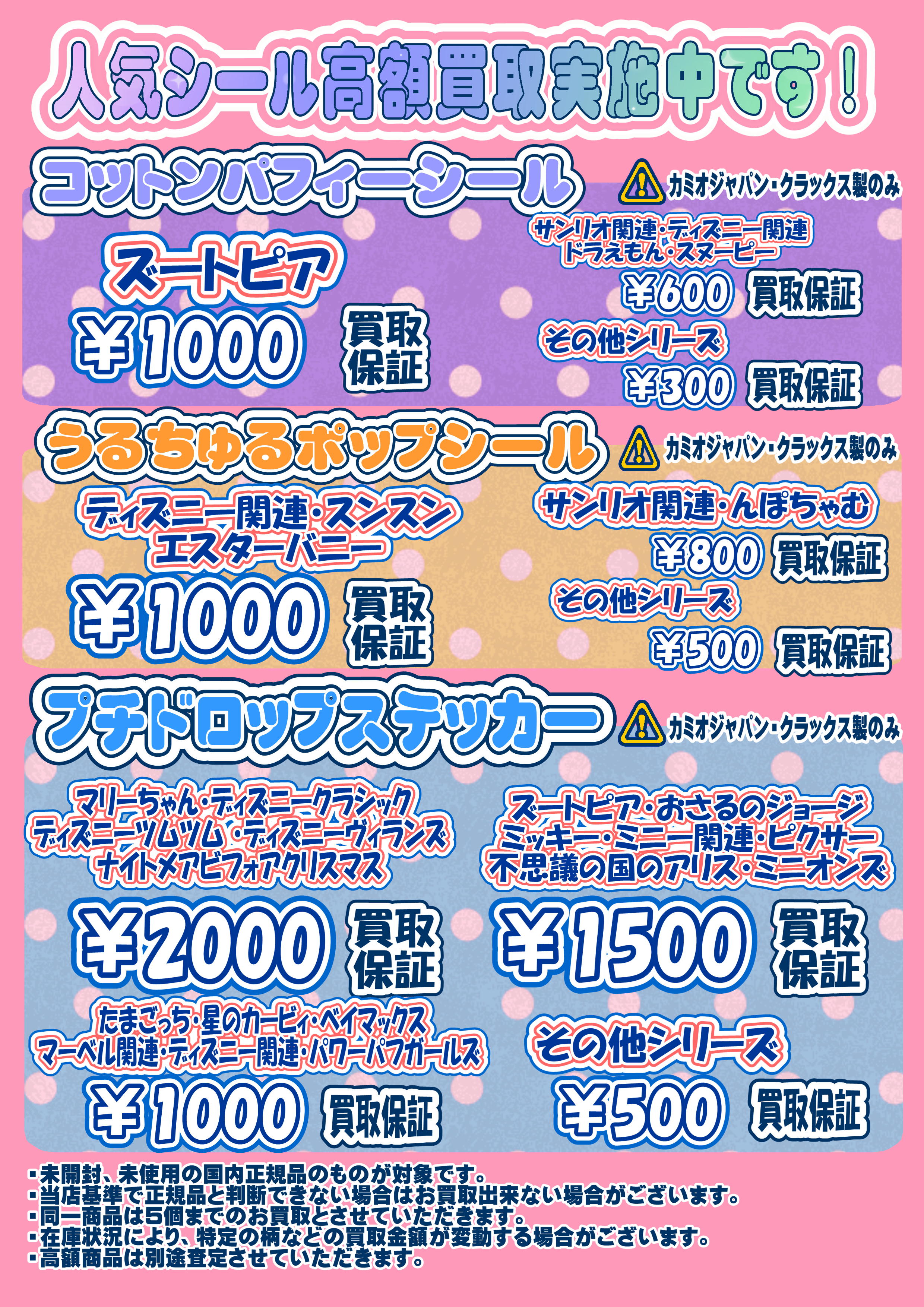 ・在庫状況により、特定の柄などの買取金額が変動する場合がございます。