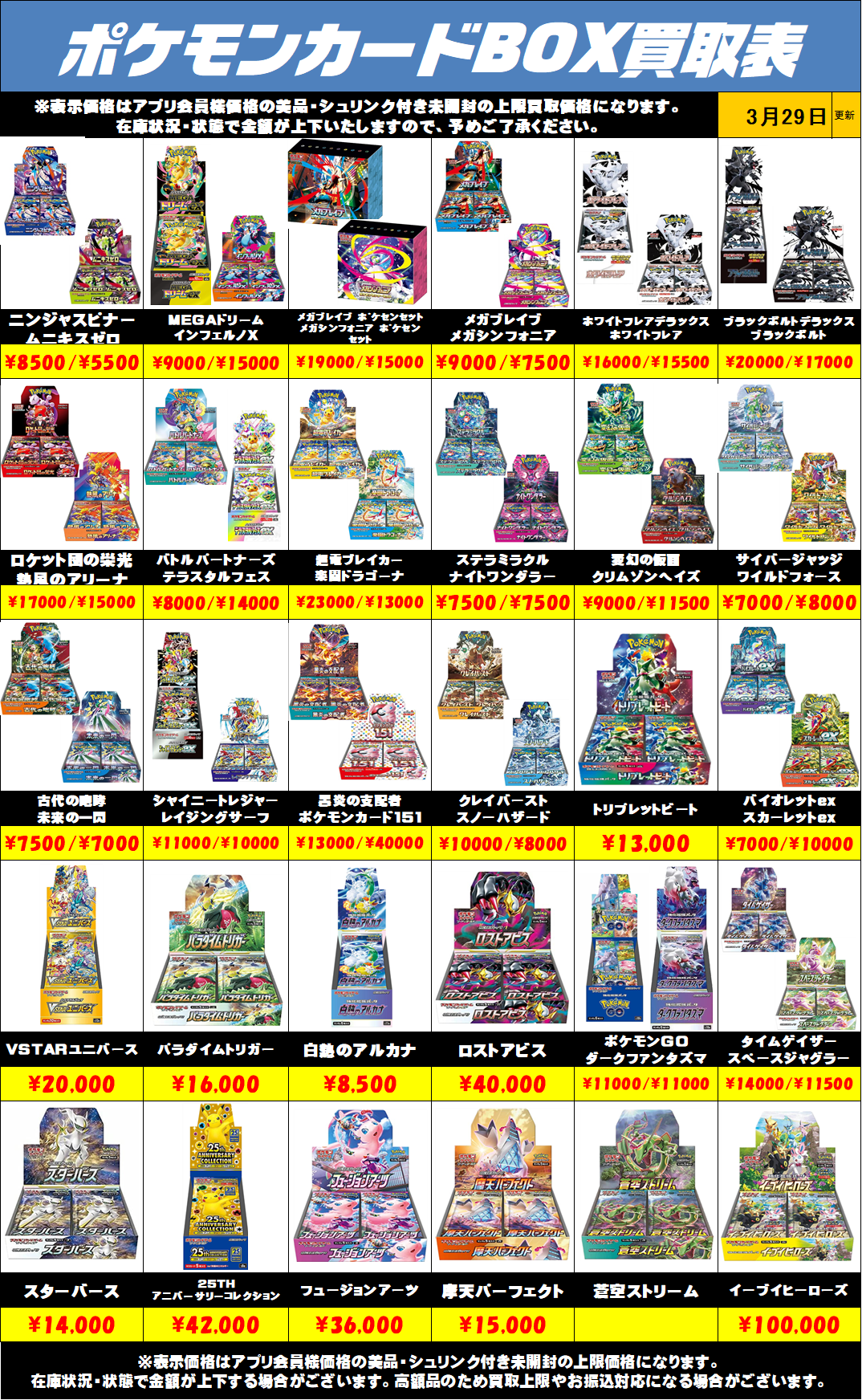 予告なく在庫により金額が上下する場合がございます。 値段表記がないパックに関しましては、現在買取を行っていないものになります。ご了承ください。