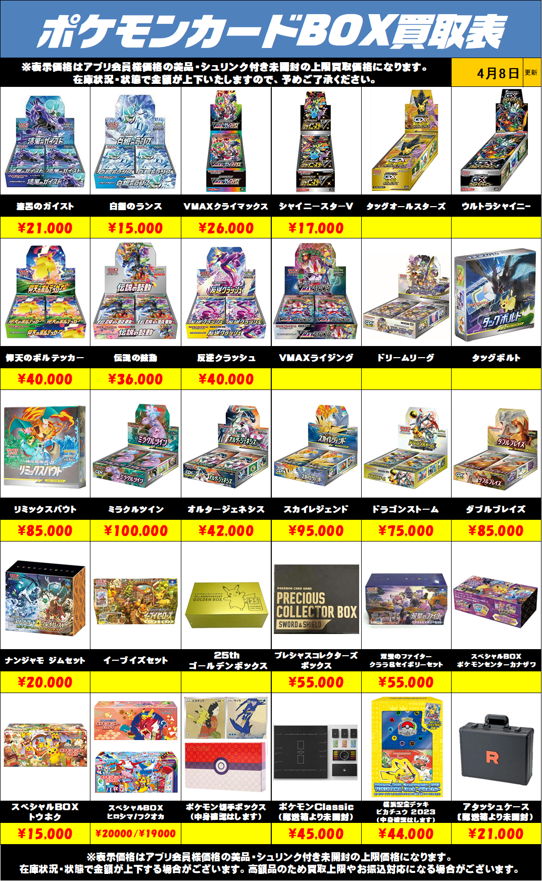 未開封・美品・メーカーテープ付きの店頭・アプリ会員様の買取価格を表示しております。 予告なく在庫により金額が上下する場合と買取上限や、お振込対応になる場合がございます。 BOXの状態によりお買取り出来 …