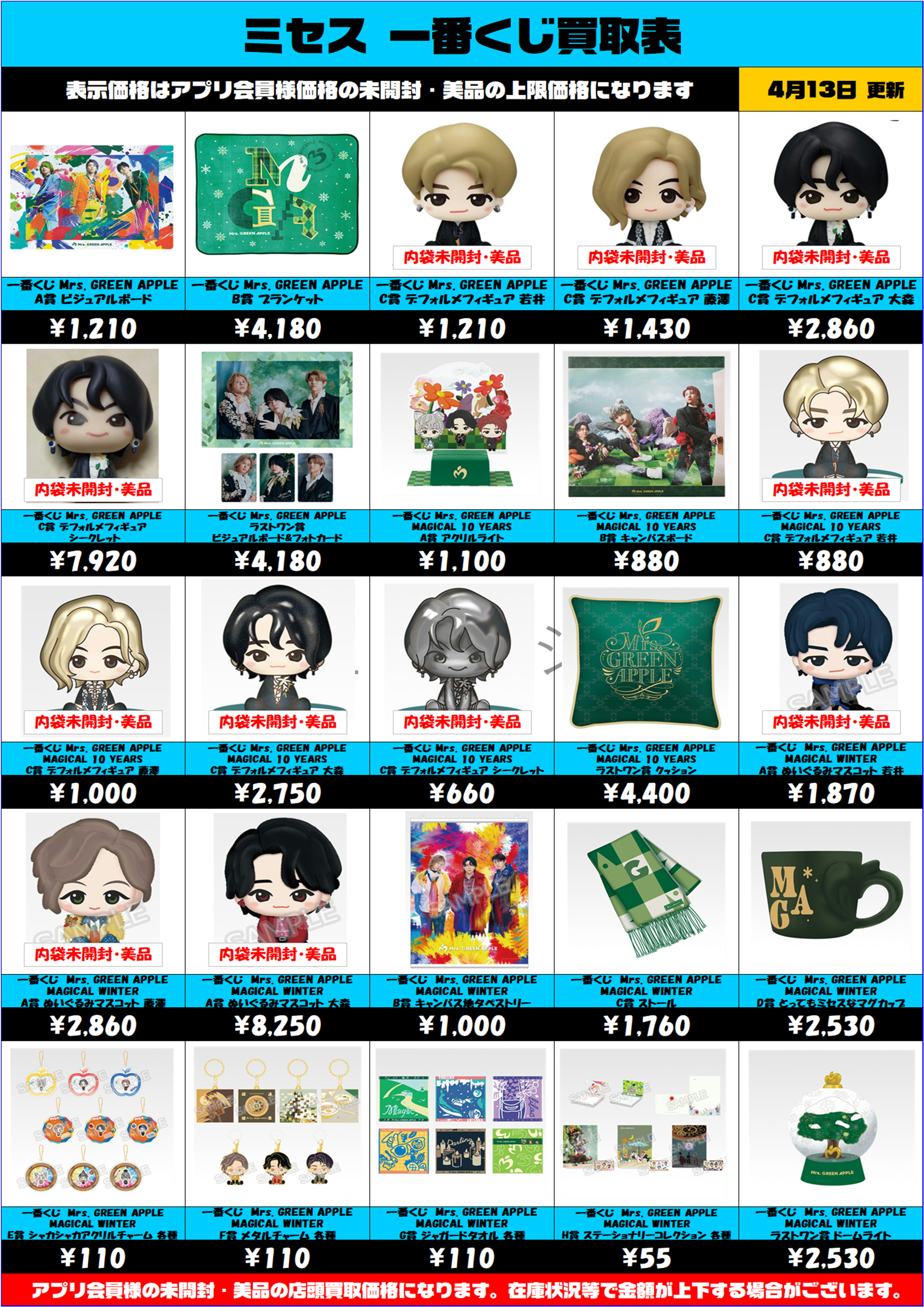 | 一番くじ Mrs. GREEN APPLE ラストワン賞 ビジュアルボード&フォトカード | 4180 |