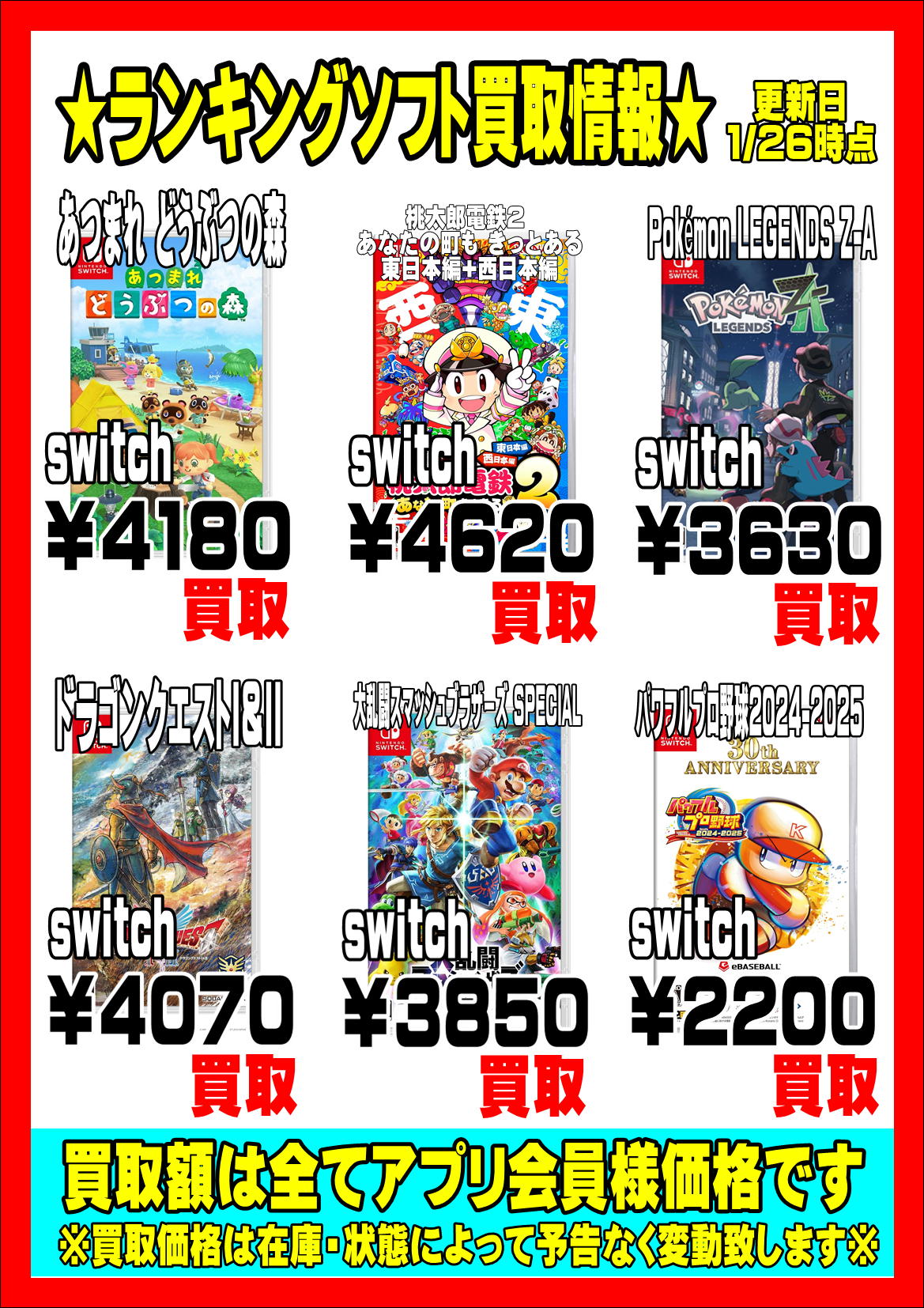 ★週間ゲームソフトランキングNSW強化買取情報!!!!!★1/26現在
