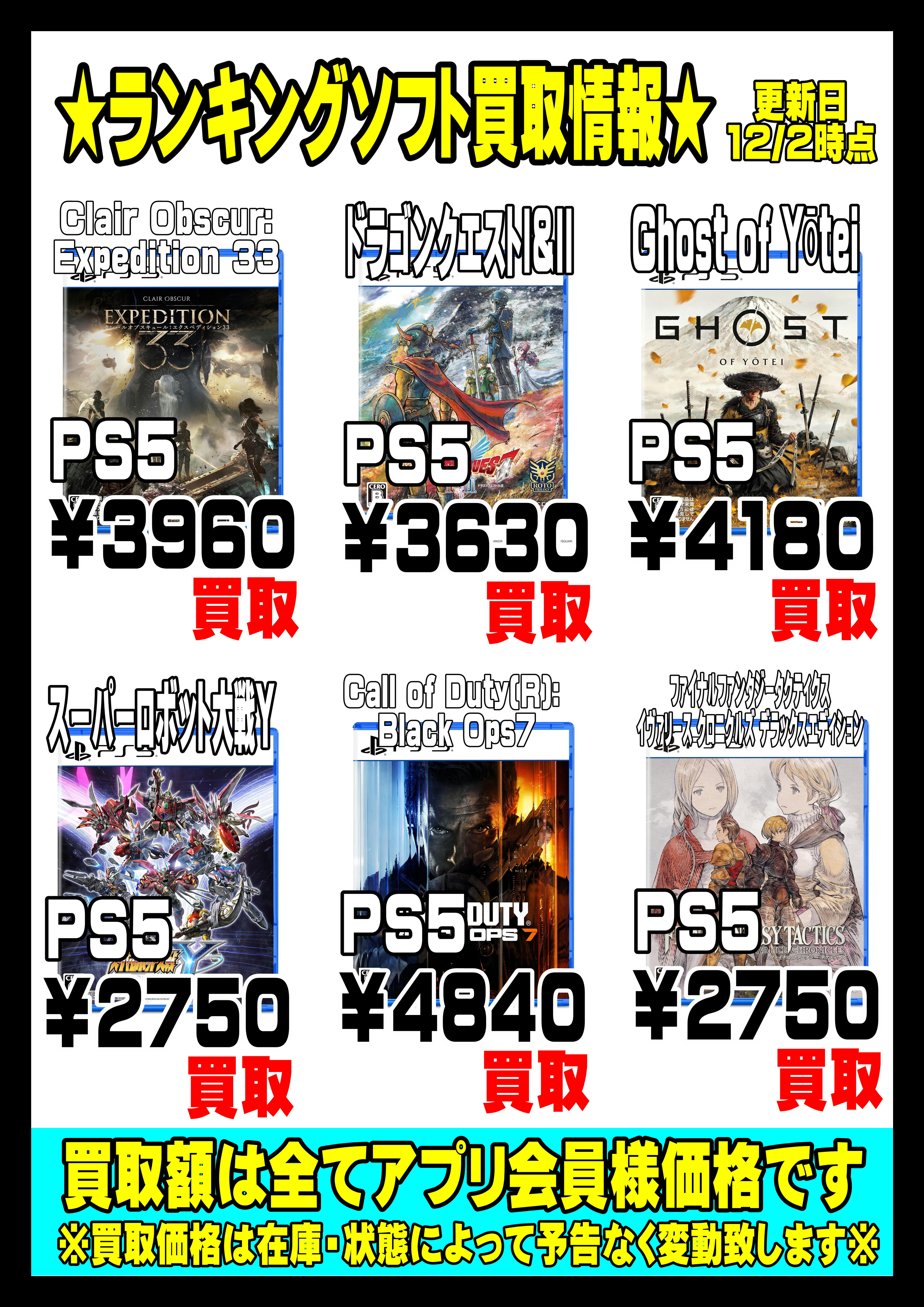 ★週間ゲームソフトランキングPS5強化買取情報!!!!!★12/2現在
