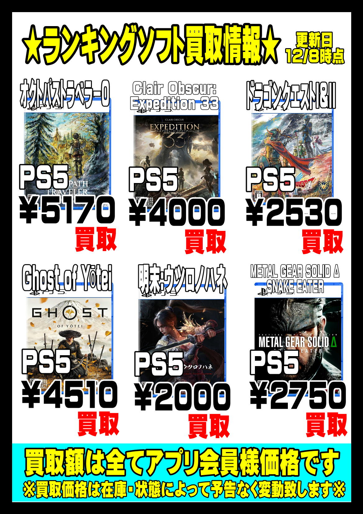 ★週間ゲームソフトランキングPS5強化買取情報!!!!!★12/8現在